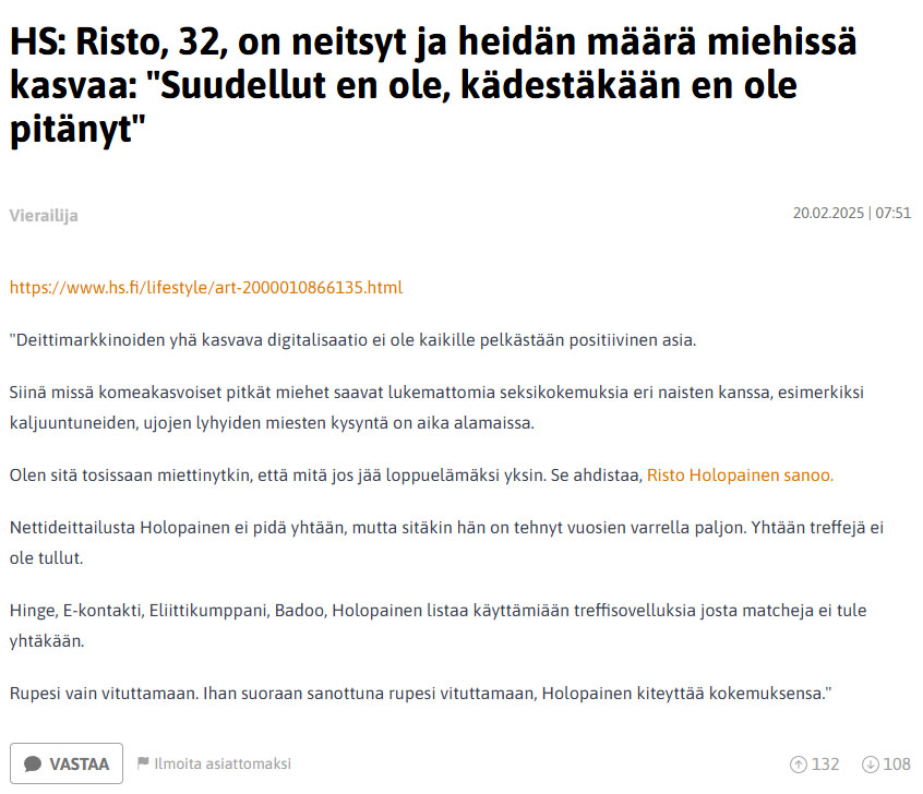 Tämä artikkeli jaettiin neljälle alustalle, jotka olivat Ylilauta, Vauva.fi, Reddit ja Suomi24. Kahdessa jälkimmäisessä keskustelu aiheesta vaikutti olevan jopa yllättävän asiallista. IHME, mutta onneksi Ylilauta ja Vauva.fi toimittaa ja tasapainottaa.